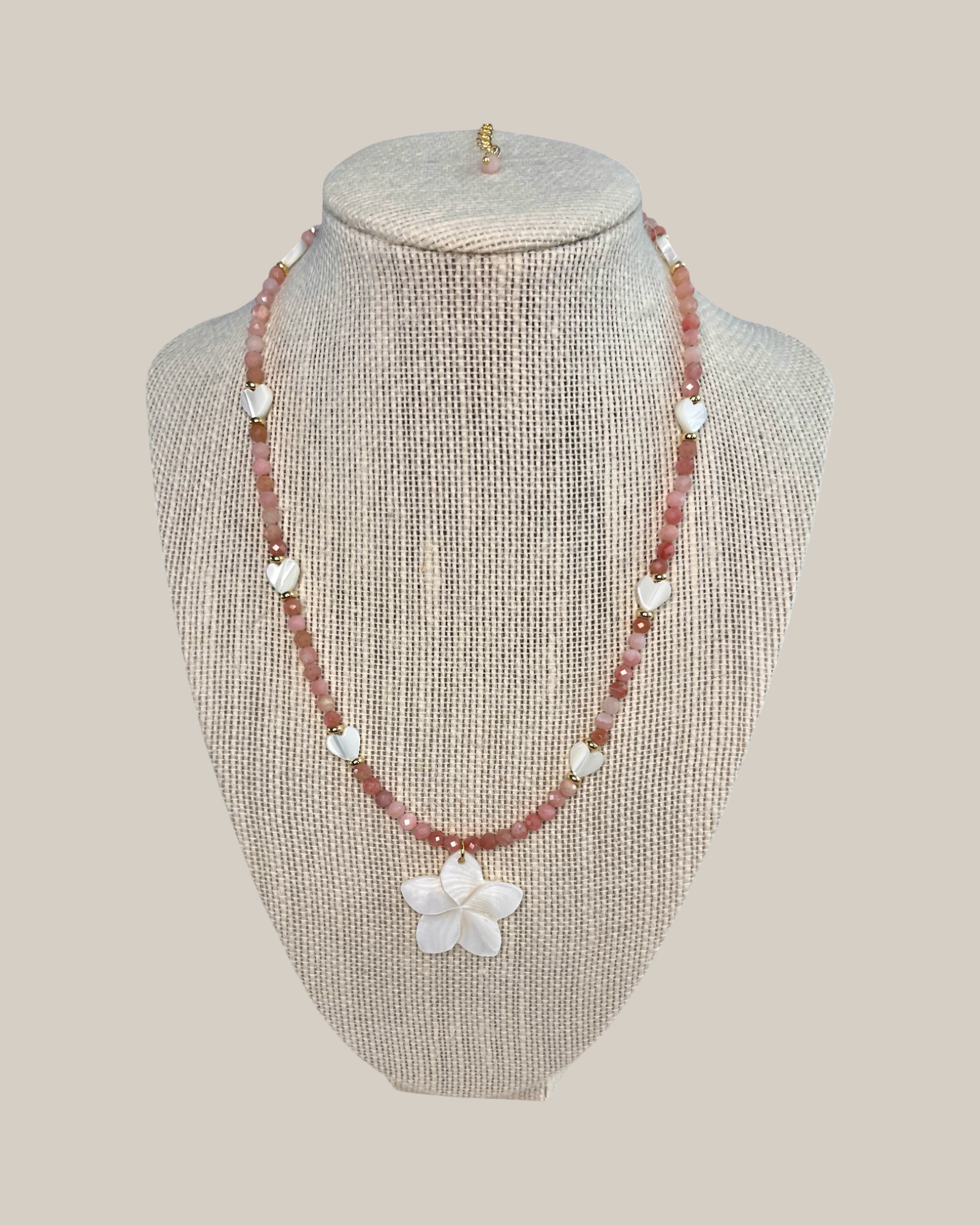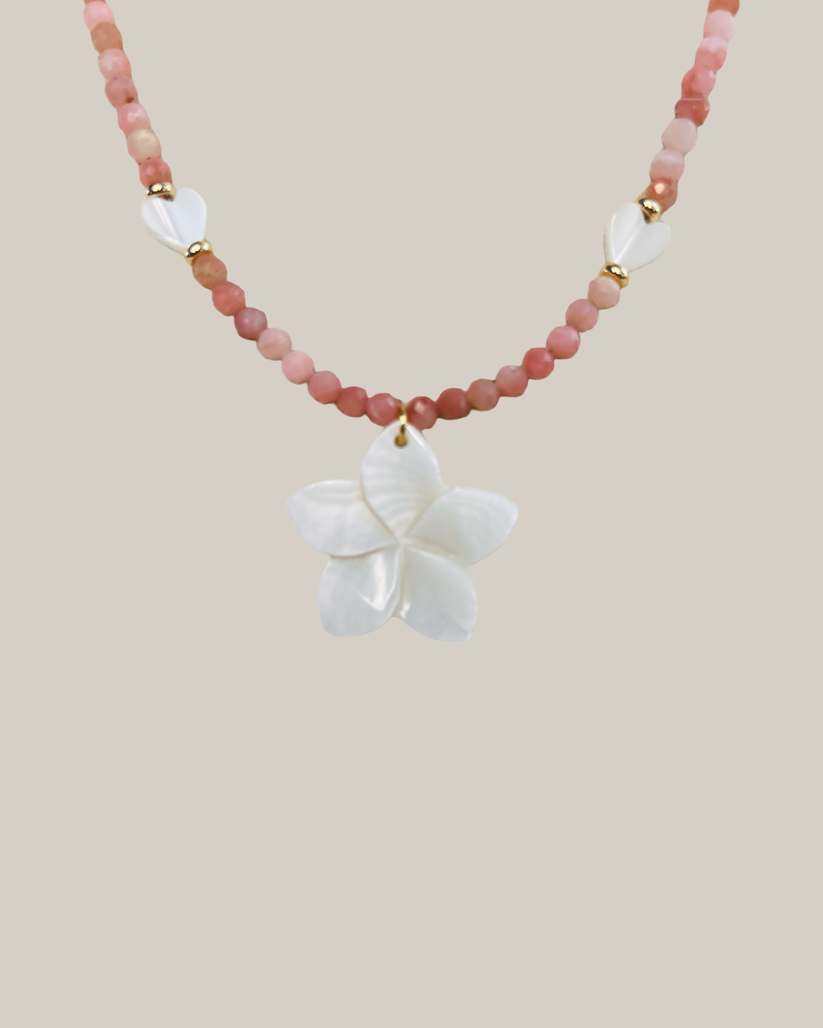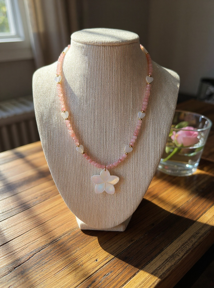 The Blossom of Love Necklace is a stunning creation that brings together soothing pink opal beads, lustrous Mother of Pearl hearts, and a radiant Mother of Pearl floral pendant. A celebration of tenderness and connection, it carries the gentle energy of love in bloom.
