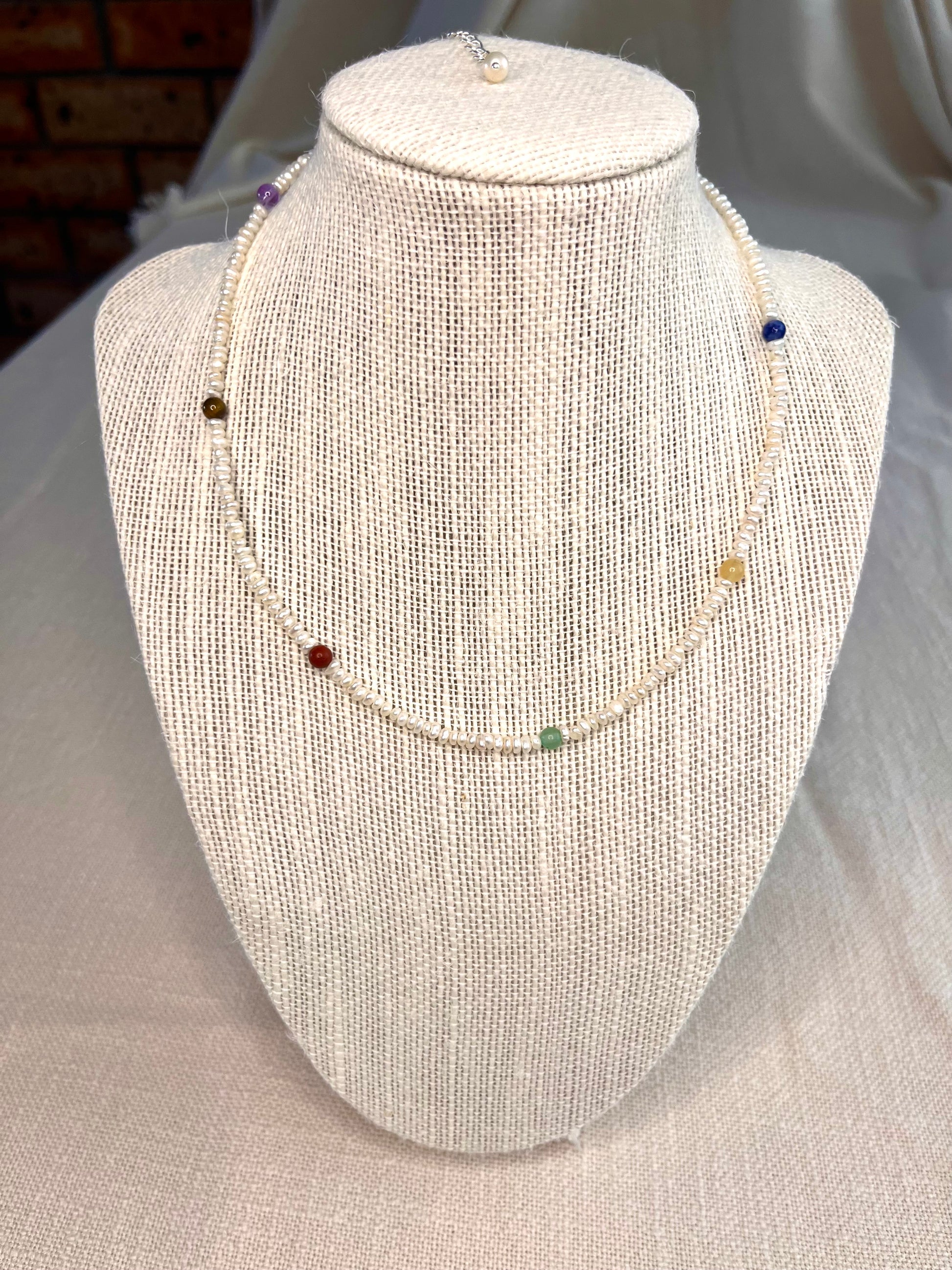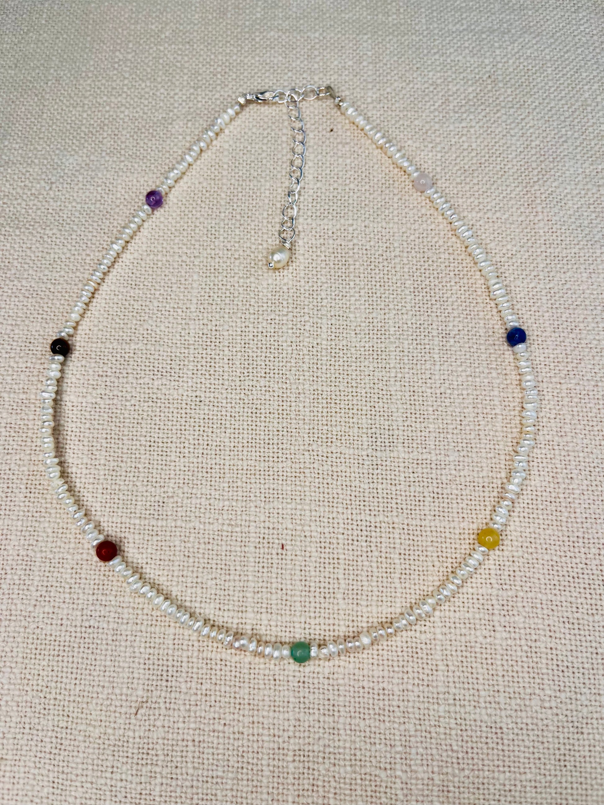 The Celestial Tide Necklace is handcrafted with luminous freshwater pearls and a spectrum of Chakra gemstones. This necklace radiates balance and light.