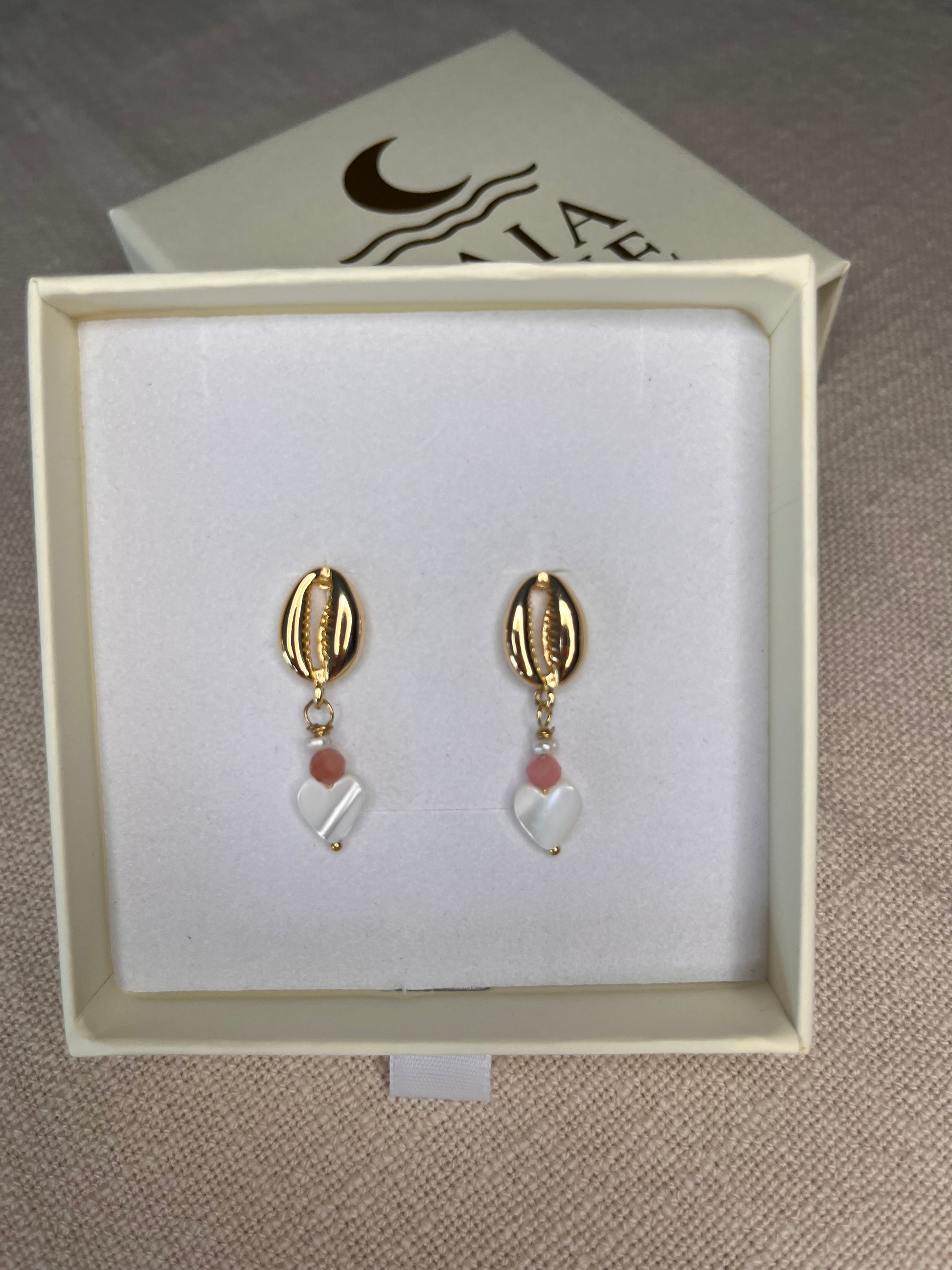 The Coastal Heart Cowrie Earrings blend Cowrie shells with gentle hues of pink and white. Each piece reflects love in its purest form — calm, kind, and deeply connected to the rhythm of the ocean.