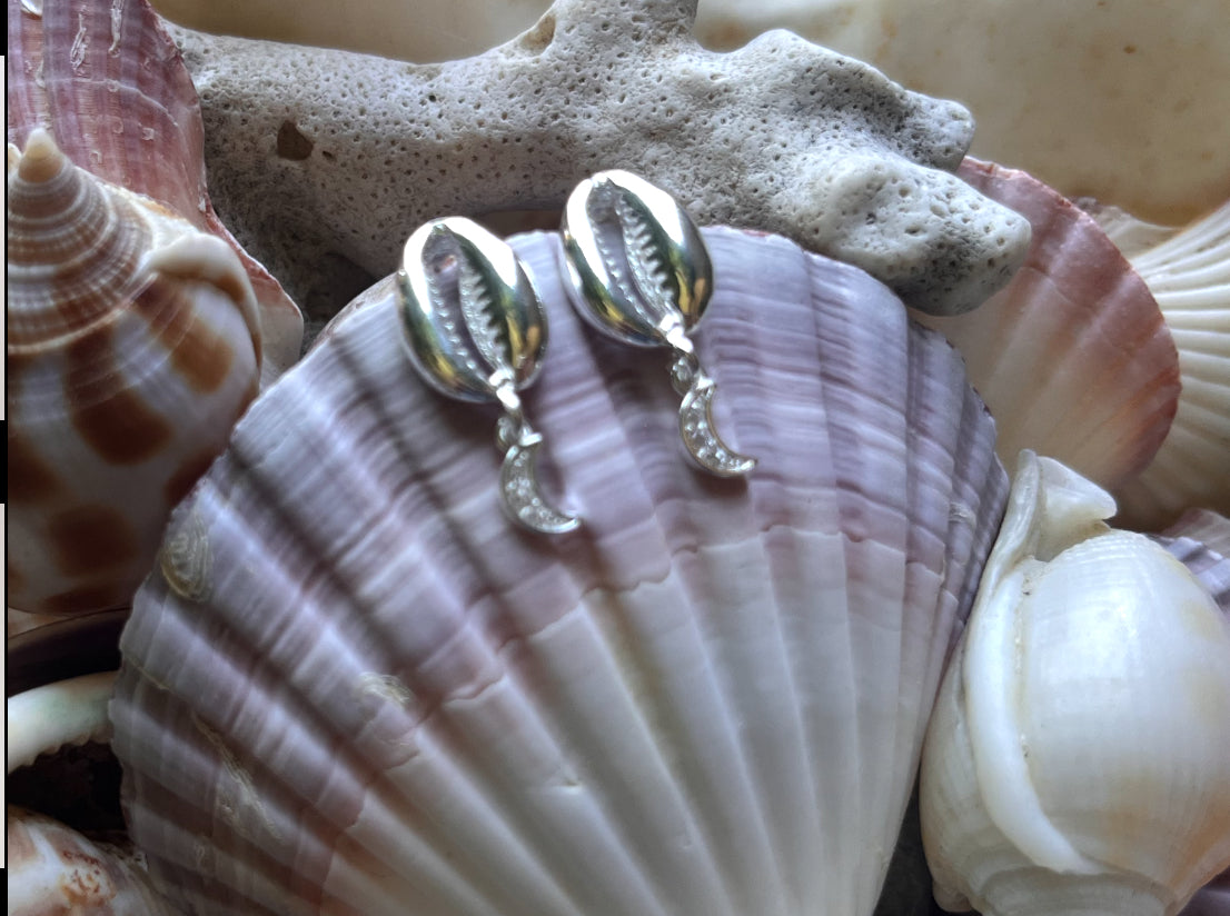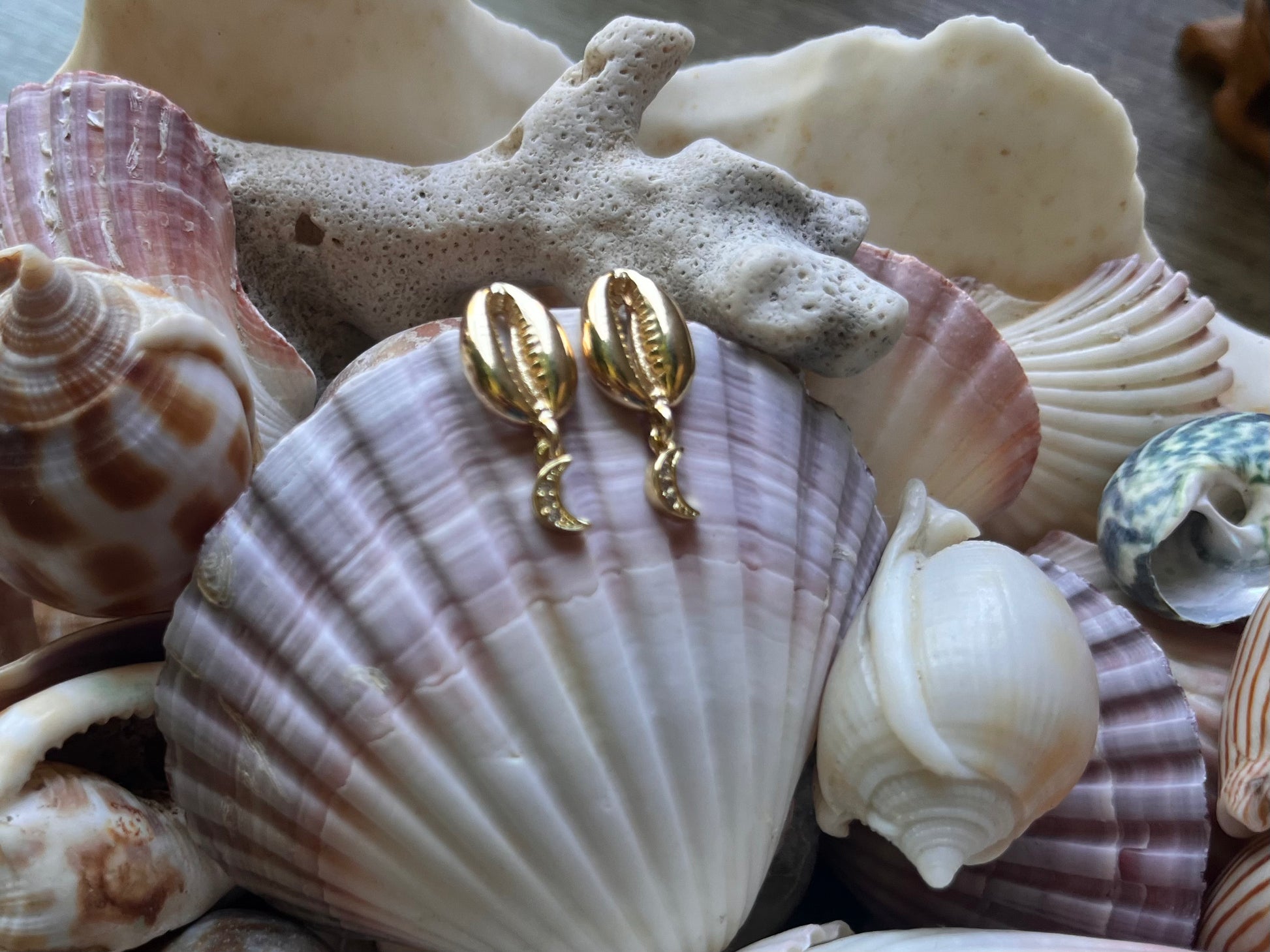 The Coastal Moon Earrings capture the shimmer of moonlight dancing upon golden tides. Featuring polished cowrie shells and delicate crescent moons, they’re a poetic ode to intuition, femininity, and the gentle rhythm of the waves.