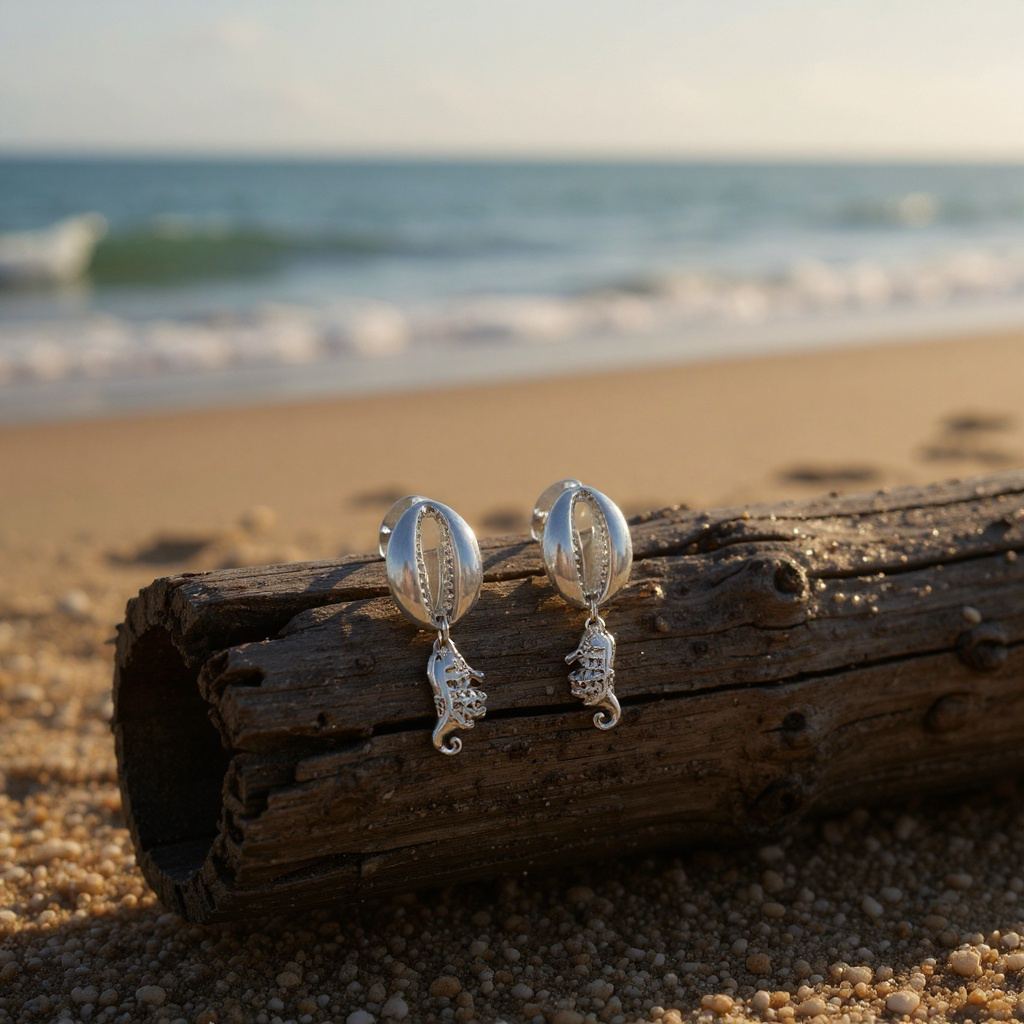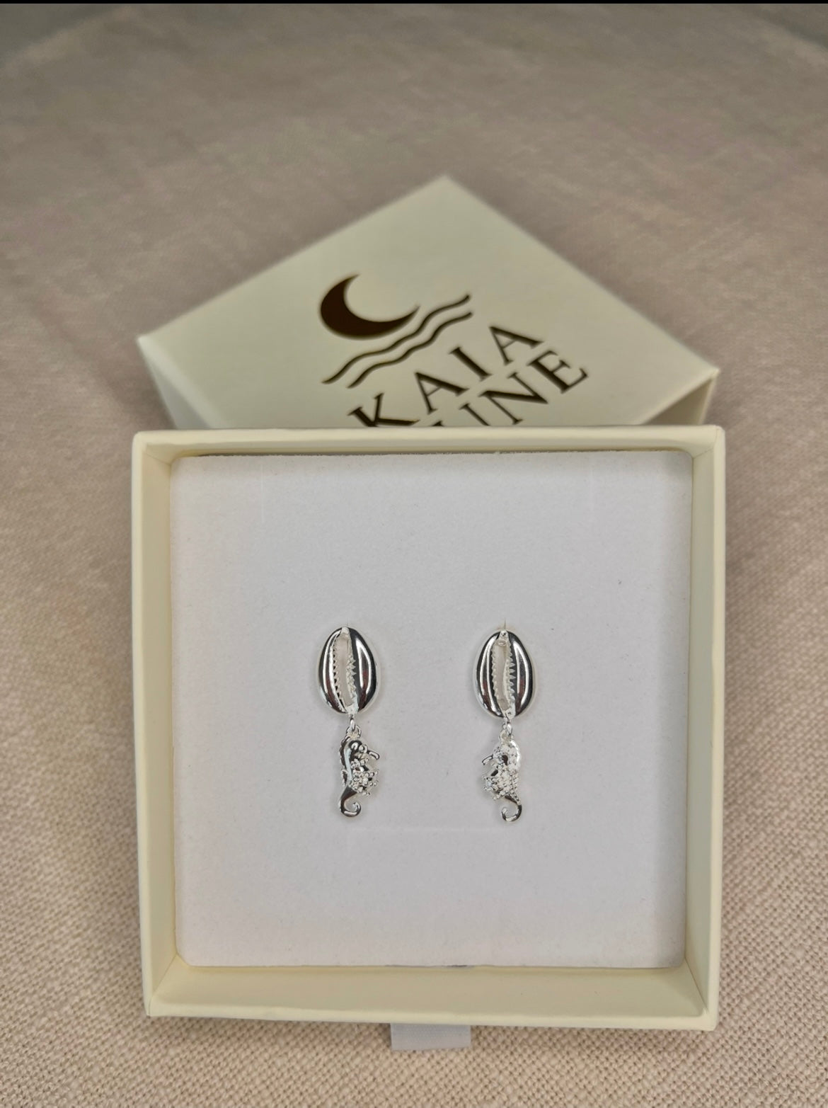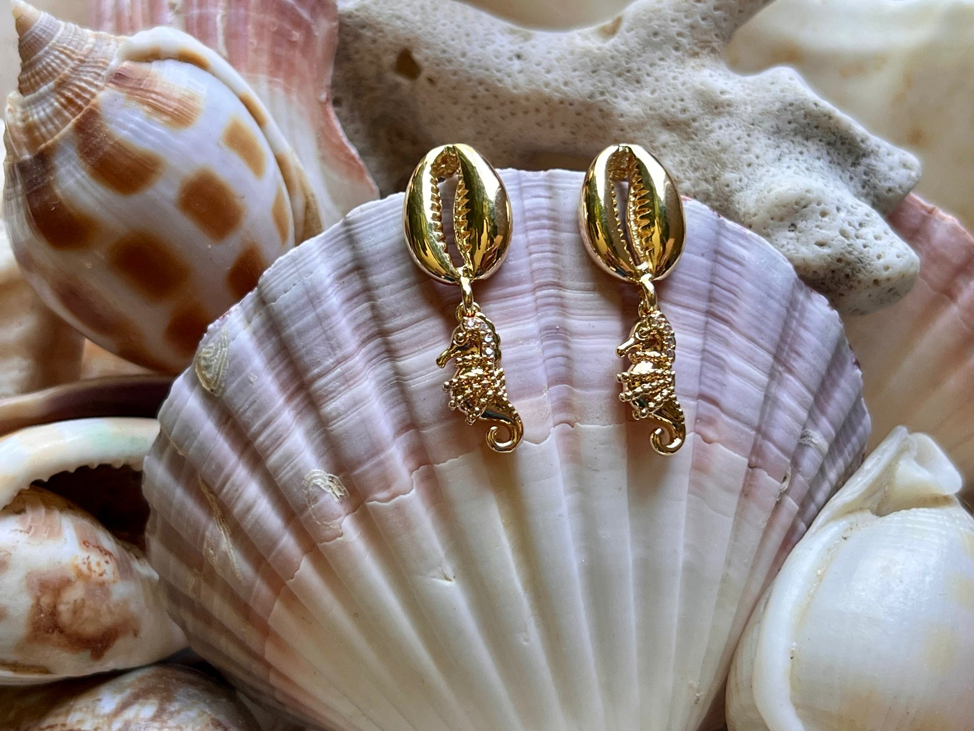 Handcrafted with polished cowrie shell earrings and dainty seahorse charms with the sparkle of Cubic Zirconia’s, these earrings capture the balance between gentleness and resilience.