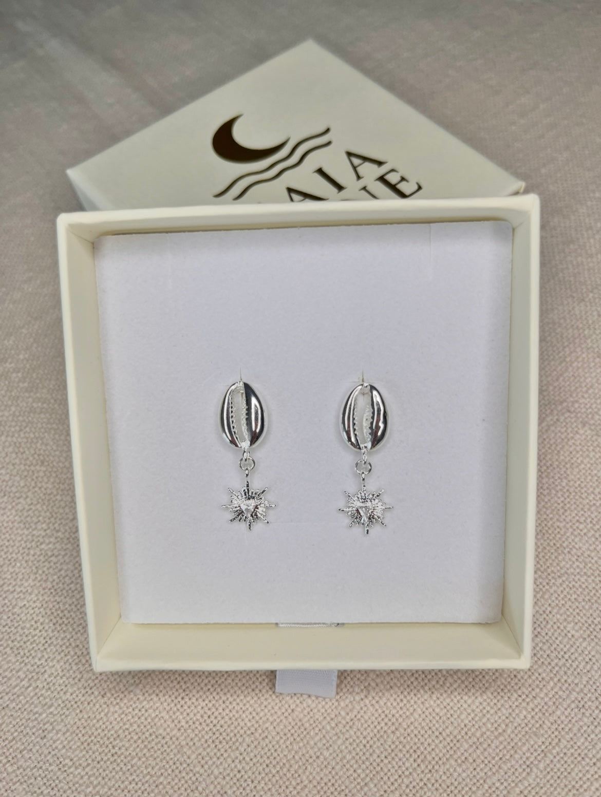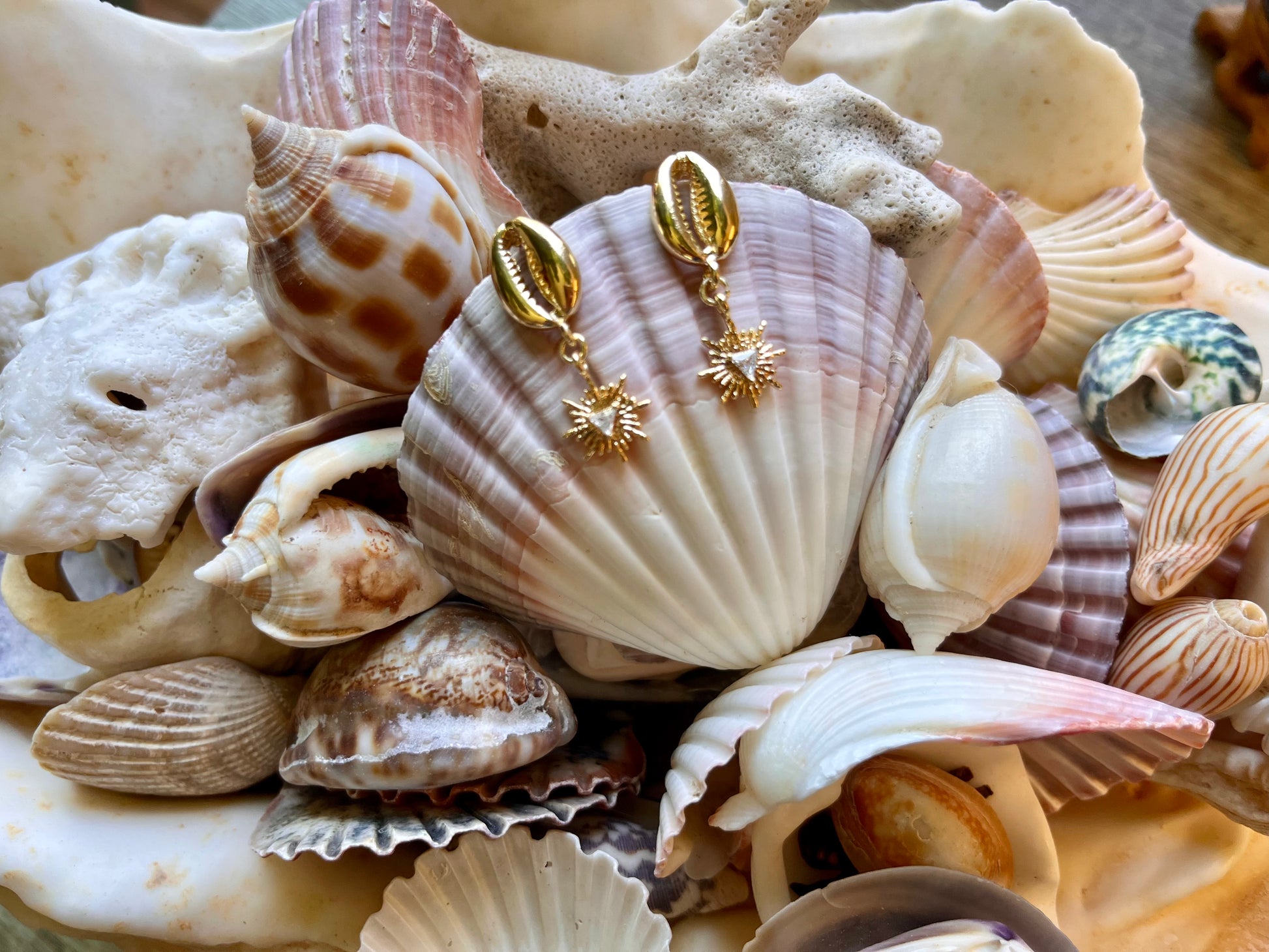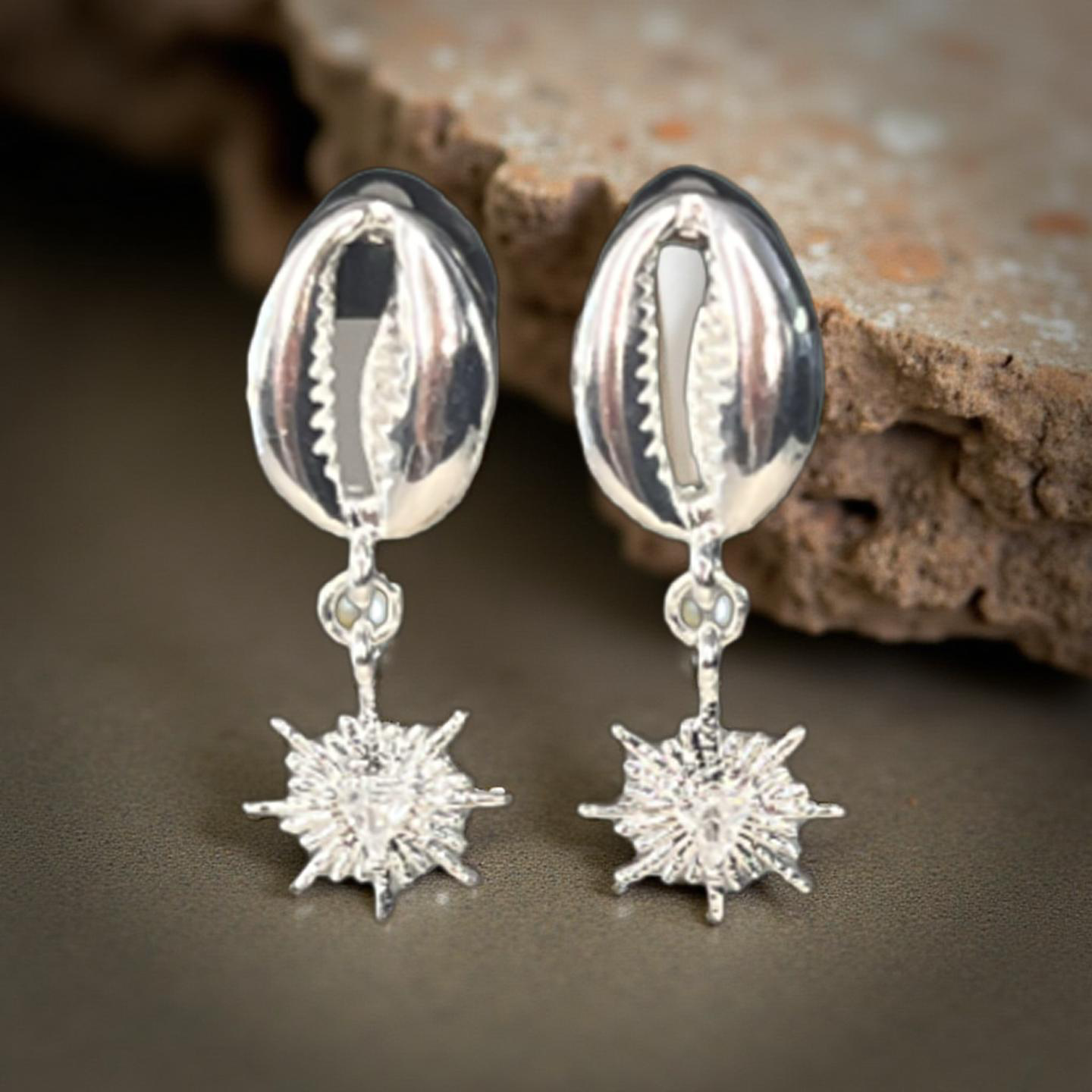 Coastal Sunburst Cowrie Earrings radiate the warmth and brilliance of ocean light. Cowrie shells and a sparkling sunburst charm with a cubic zirconia centre stone.
