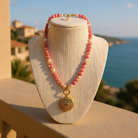 The Spiral of Love Necklace weaves golden Nautilus spirals with rare rhodochrosite beads and freshwater pearls— a symbol of heart healing, connection, and flow.