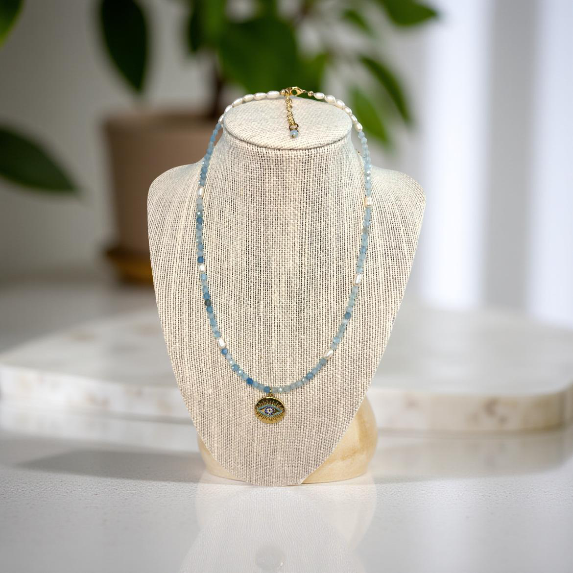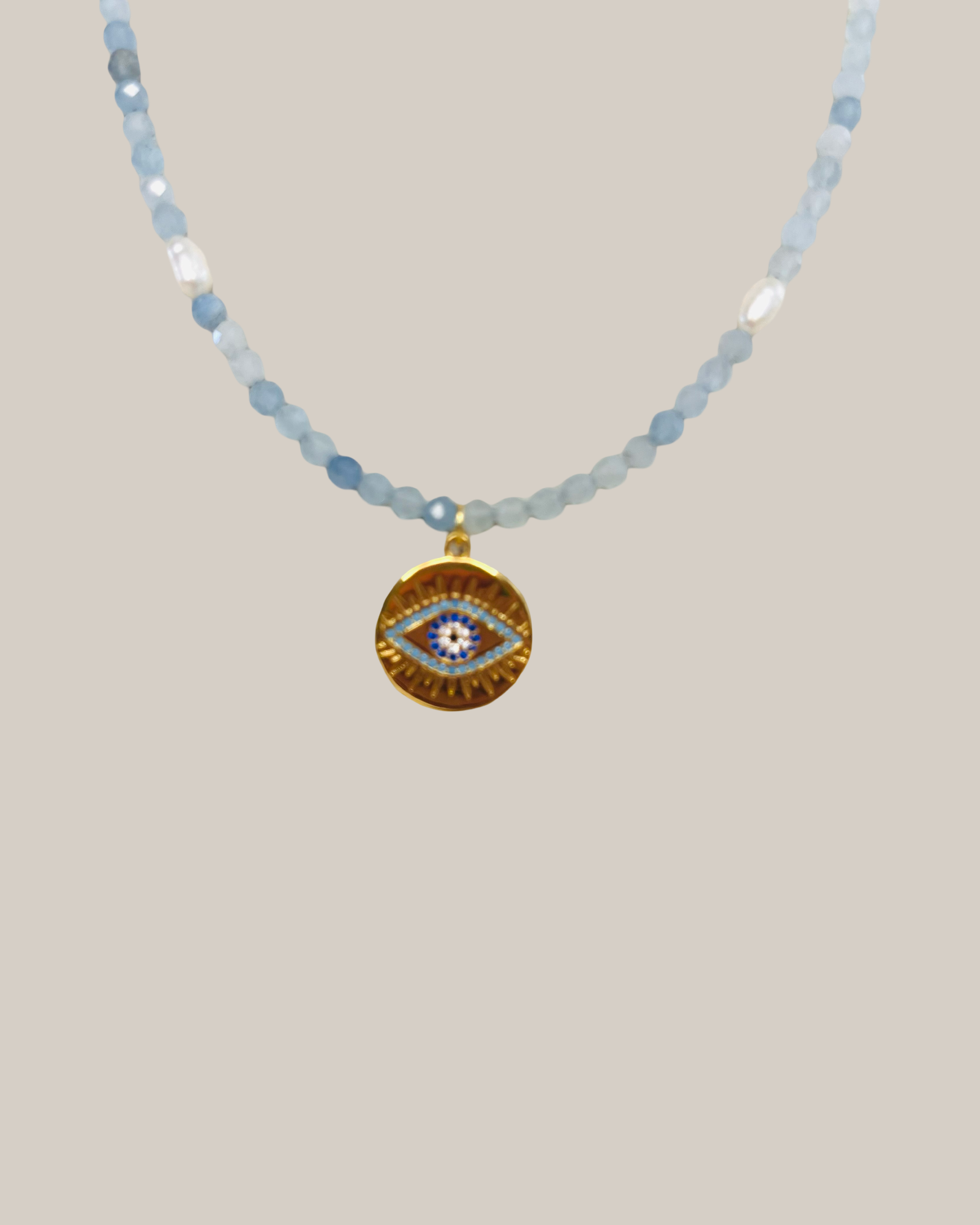 The Eye of the Sea Necklace is a luminous piece crafted with the calming blues of Aquamarine faceted stones and the timeless purity of freshwater pearls. At its heart rests the Eye of the Sea, a radiant symbol of protection, clarity, and intuition.