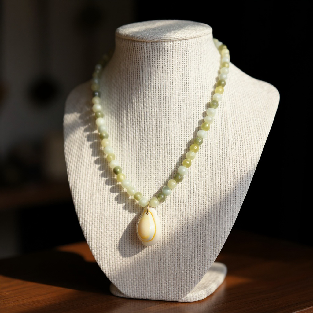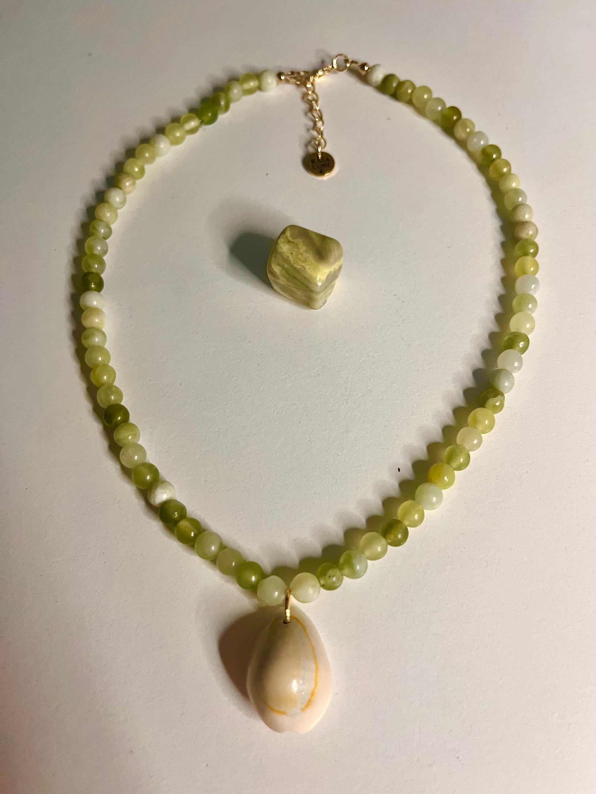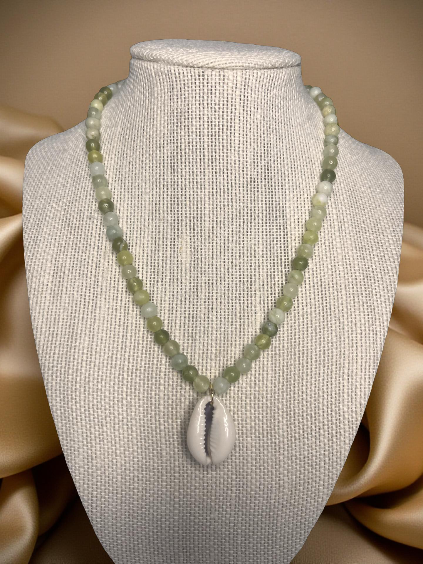 Stunning Natural 6mm Serpentine Jade beads invite grounding energy & emotional harmony, while a genuine Cowrie Shell honour’s the ocean’s ancient wisdom and protective spirit.