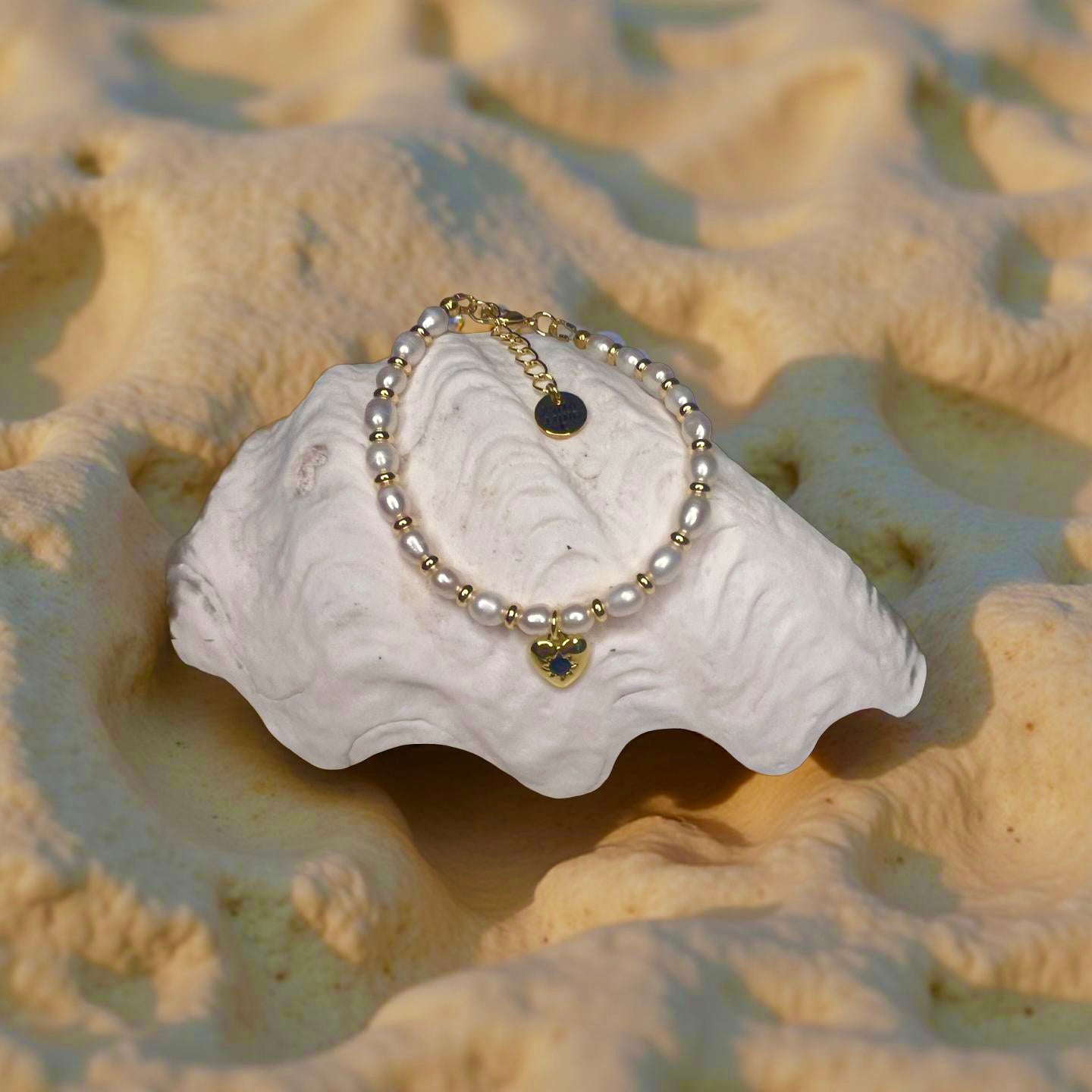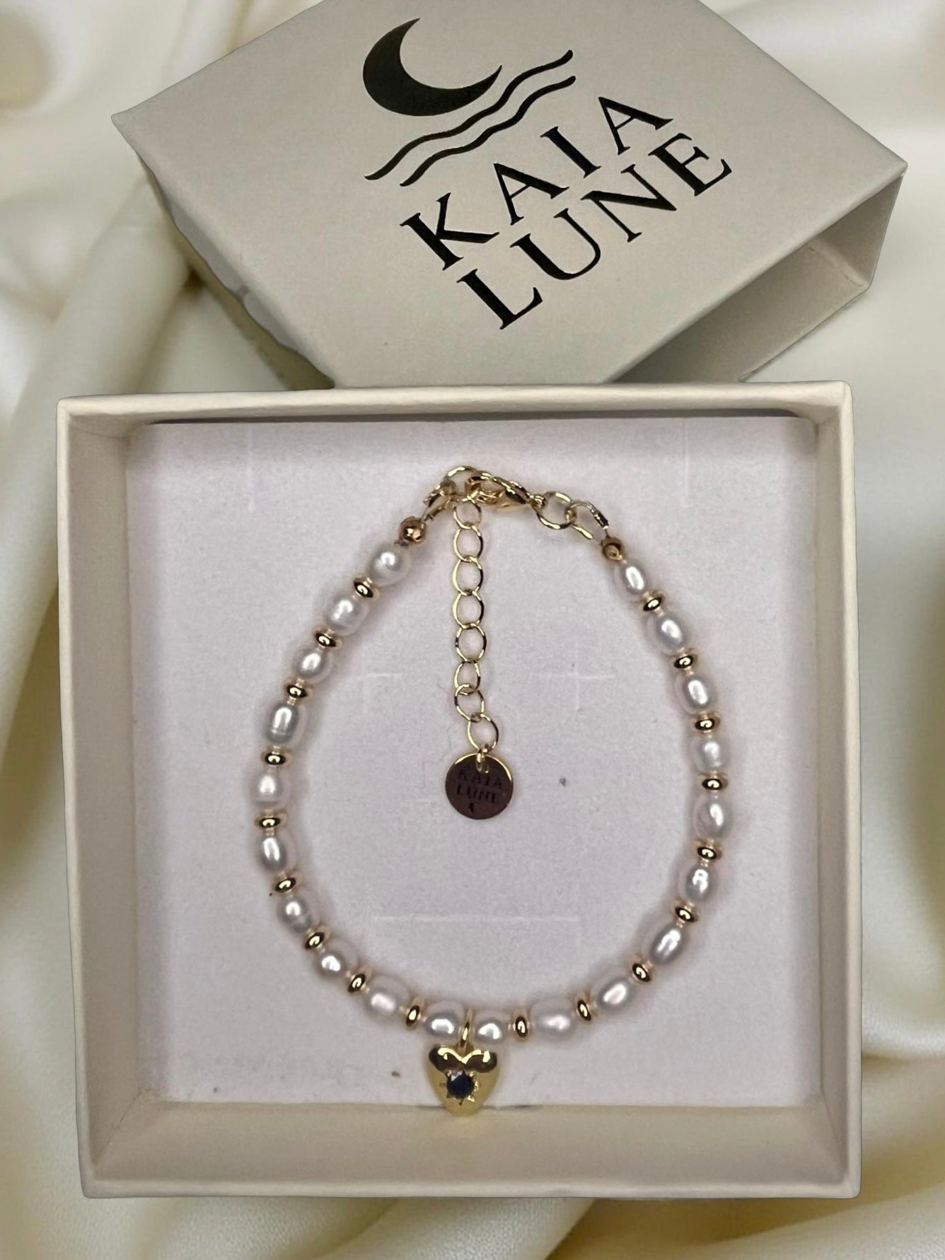 The Luna Heart Bracelet is a delicate union of Freshwater Pearls, 18k Gold plated rondelle spacer beads with an18k Gold Plated heart charm with a Sapphire Blue Cubic Zirconia in the centre.