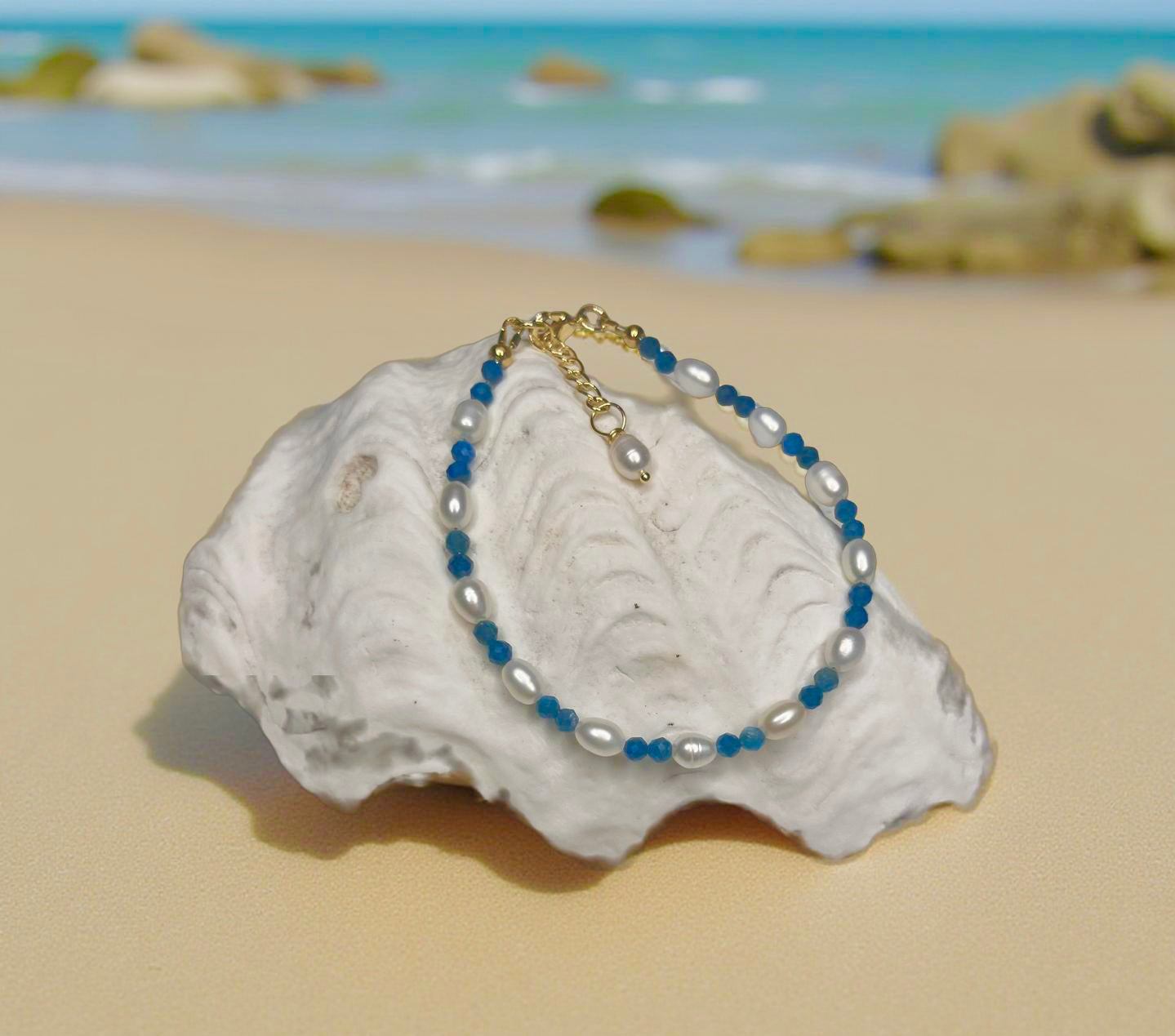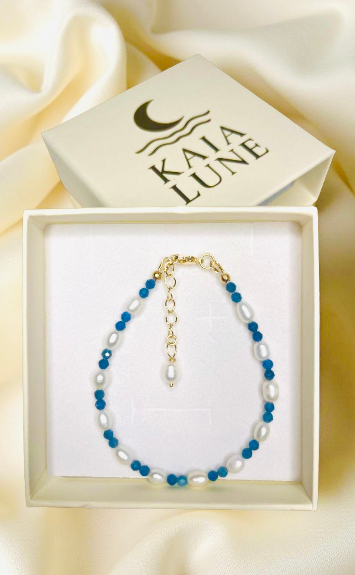 The Luna Tide Bracelet blends the depths of the vivid faceted 3mm Apatite stones with the soft luminescence of 4mm Freshwater Rice Pearls. A piece that embodies flow, clarity, and emotional renewal. A reminder to move with life’s natural currents.