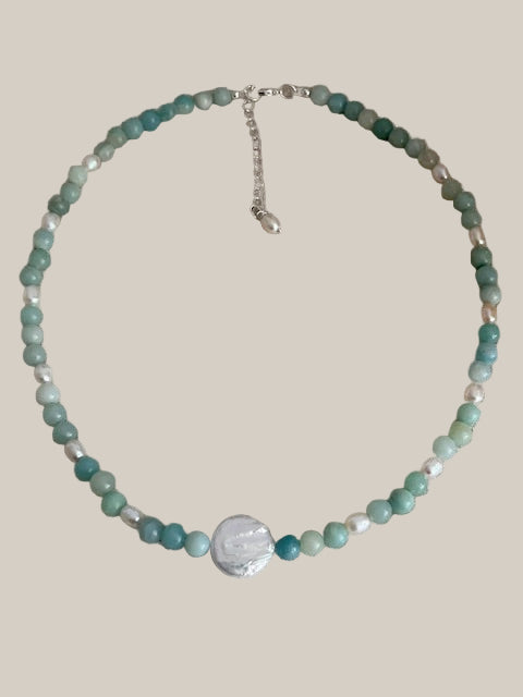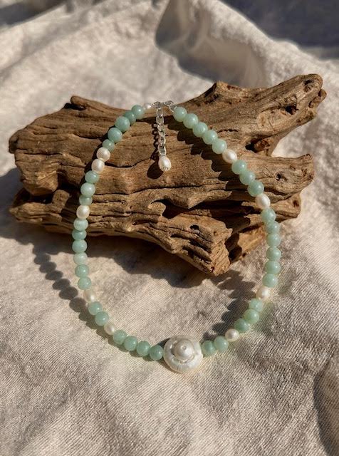 The Moonlit Shore Necklace is a one of-a-kind piece featuring soothing Amazonite beads, lustrous Freshwater Pearls, and a radiant Mother of Pearl coin centrepiece. A symbol of balance and harmony, it captures serenity and strength, like moonlight reflected on gentle tides.