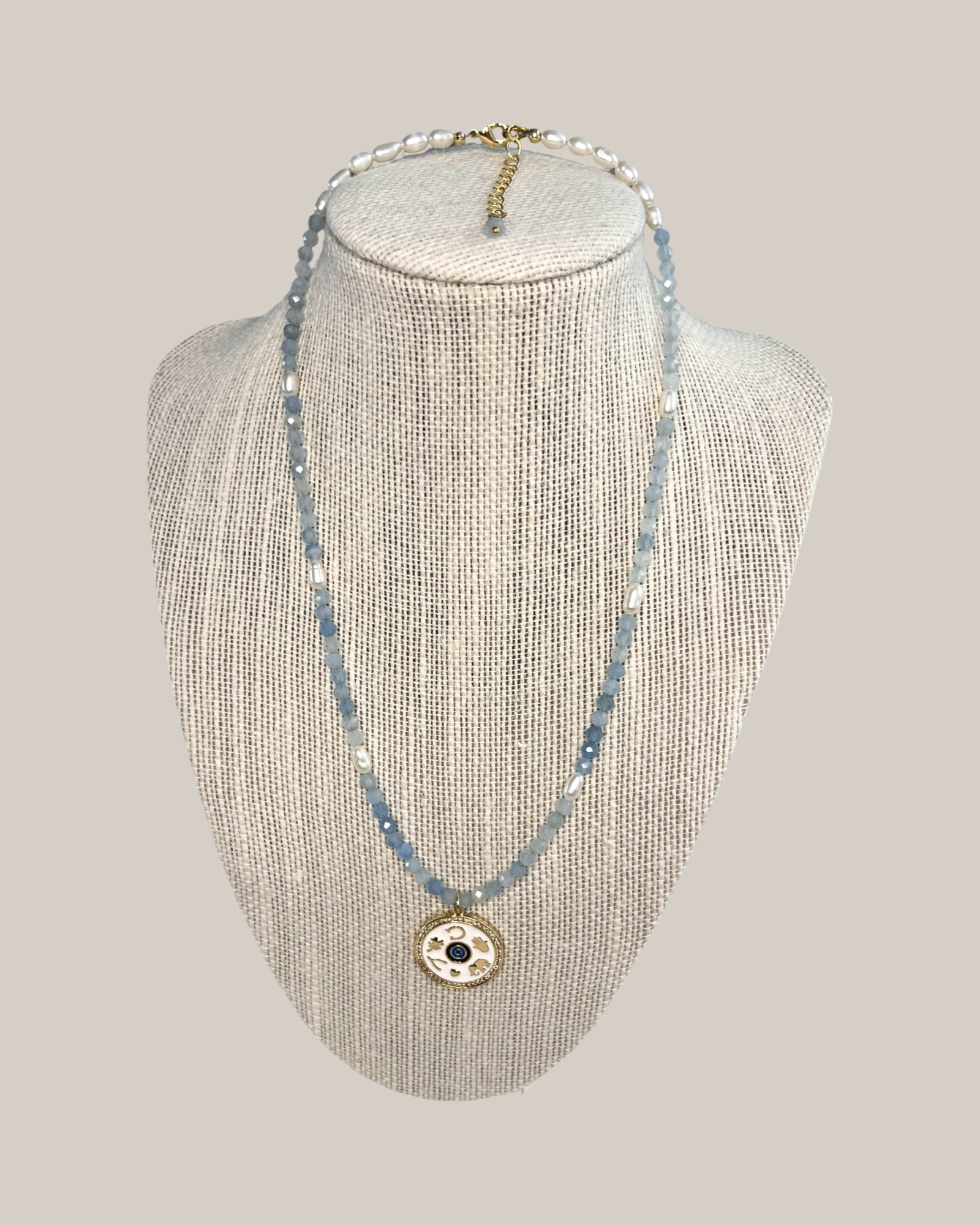 The Ocean Talisman Necklace brings protection, blessings, and calm, woven from the soothing blues of faceted aquamarine stones and the timeless purity of freshwater pearls. At its centre rests the Ocean Talisman, a circle of symbols representing luck, harmony, and spiritual guidance.