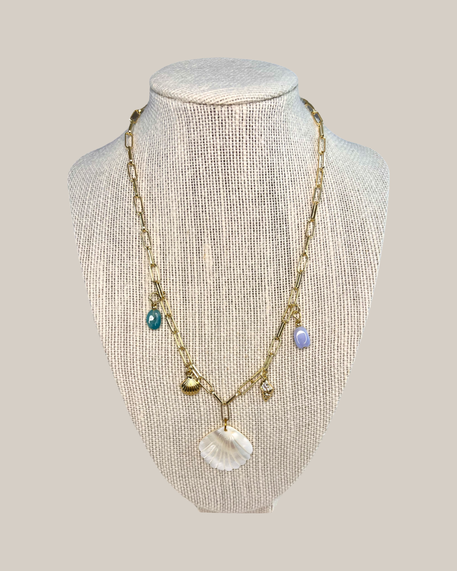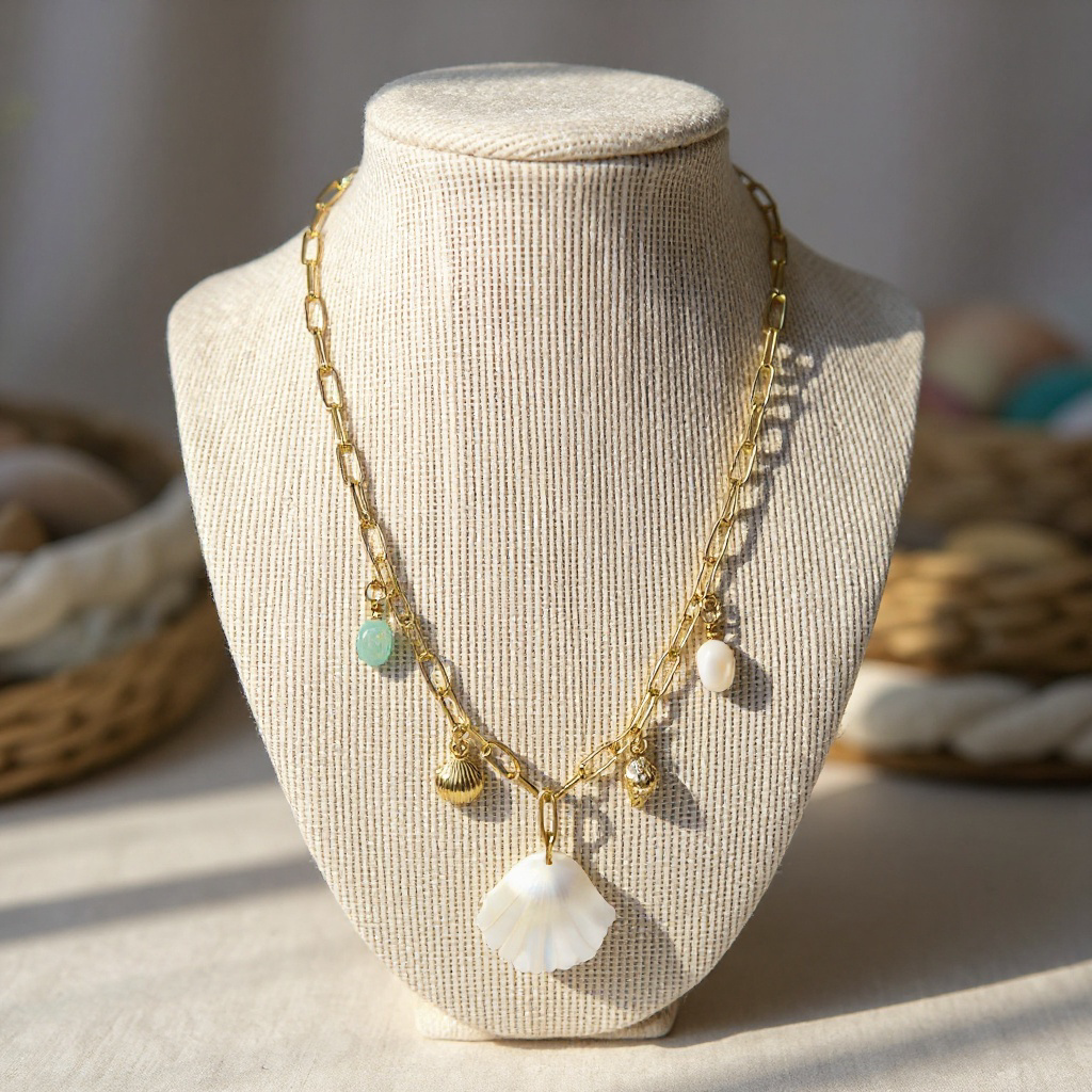 A Mother of Pearl shell pendant shimmers at the centre, accompanied by delicate gold charms each symbolising flow, intuition, and transformation.