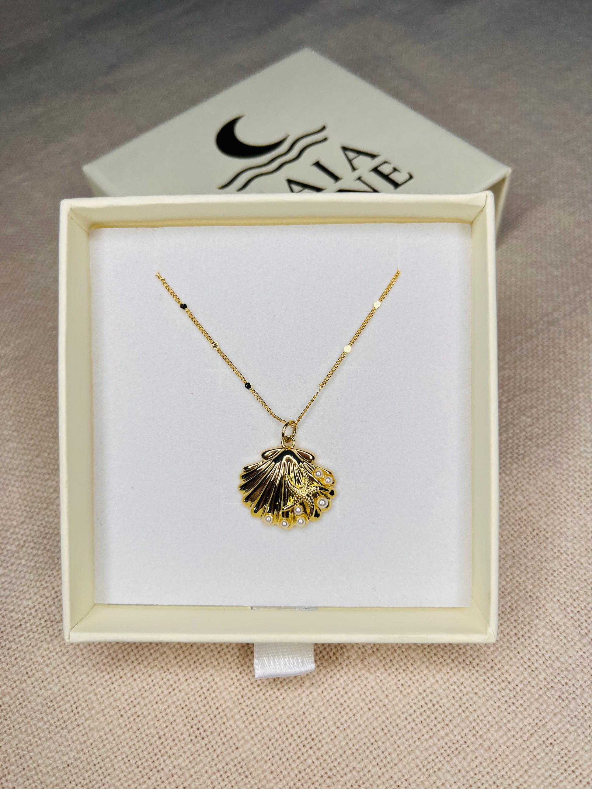 The Tidal Treasure Necklace is a true ocean treasure. A Clam shell pendant adorned with a dainty starfish and accented by lustrous Fresh Water pearl details. The layered textures of shell, starfish, and pearls evoke the depth and movement of the ocean.